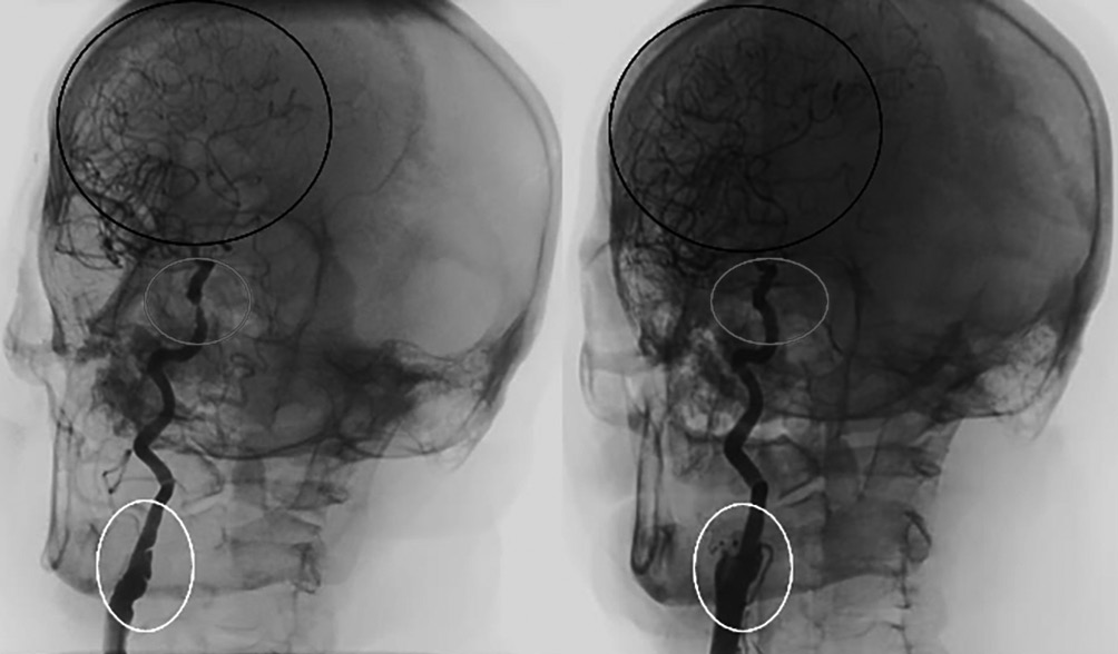 Учитывая характер бляшки по данным УЗДГ, отсутствие признаков геморрагического поражения, а также отсутствие ранних признаков ишемического поражения головного мозга по данным МСКТ, невозможность проведения тромболитической терапии (время от начала симптоматики более 4,5 ч), пациенту выполнена церебральная ангиография для определения показаний и принятия решения об эндоваскулярной тромбэкстракции. Выполнение перфузии головного мозга не проводилось, т.к. время от начала заболевания составило менее 6 ч [20]. На церебральной ангиографии выявлены стеноз правой ВСА в шейном сегменте (С1 сегмент) до 60% с признаками нестабильной бляшки (затёк контраста в полость ядра) и флотирующей интимы, стеноз правой ВСА в кавернозном сегменте (С4 сегмент) [21] до 90%. Левая ВСА, позвоночные артерии — без признаков стенозирования. Признаков артериовенозных мальформаций, аневризм головного мозга не выявлено. Тип Виллизиева круга был определён как разобщённый и классифицирован как тип Ac2Pc. Установлены отсутствие передней соединительной артерии, а также гипоплазия задних соединительных артерий [22] (рис. 2).