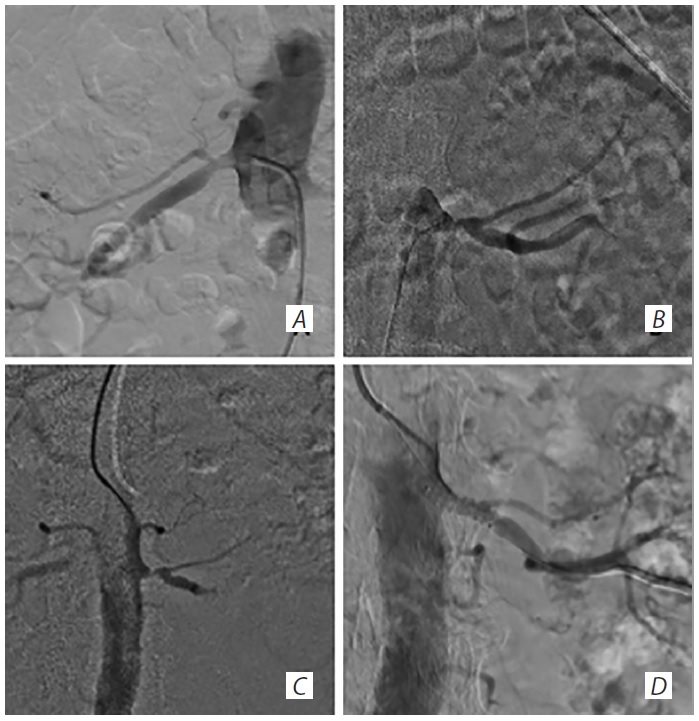 Рис. 7. Ангиография и стентирование левой ПА. А — стеноз правой ПА 30%; В — стеноз левой ПА до 80%; С — ангиография перед стентированием левой ПА; D — стентирование левой ПА. / Fig. 7. Left renal artery angiography and stenting. А — right renal artery stenosis 30%; В — left renal artery stenosis up to 80%; С — pre-stenting left renal artery angiography; D — left renal artery stenting.