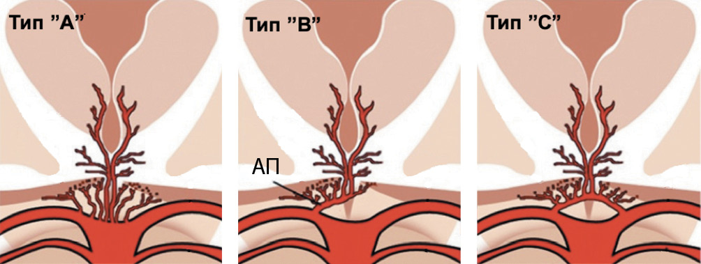 - «С» тип, при котором ТПА начинаются от сосуда, соединяющего, наподобие мостика, Р1-сегменты обеих задних мозговых артерий [2] (рис. 1).