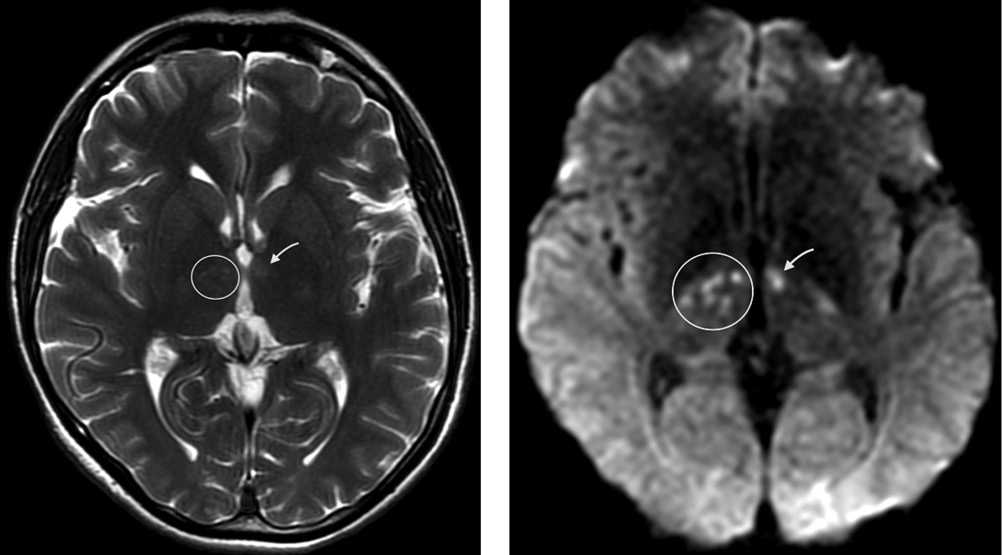 Рис. 3. МРТ головного мозга в режиме Т2 (А) и DWI (В). Стрелками и кругами показаны постинфарктные изменения в парамедианных отделах таламусов. / Fig. 3. T2-weighted brain MRI (А) and DW-MRI (В). The arrows and circles indicate the post-stroke changes in the paramedian thalamus.