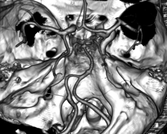 Рис. 5. КТ-ангиография головного мозга с 3D-реконструкцией. Стрелкой показана аневризма правой позвоночной артерии в интракраниальной части V4. / Fig. 5. Brain CT angiography with 3D reconstruction. The arrow indicates the right vertebral artery aneurysm in the intracranial part of V4.