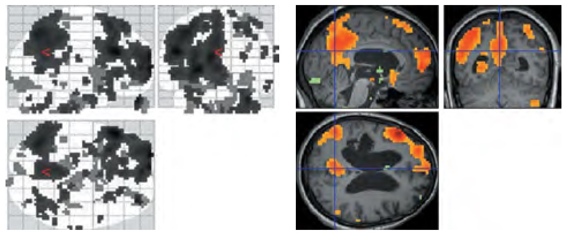 Исследования резидуальной активности коры головного мозга у пациентов с ХНС выявили важное значение полученного сигнала от зон, входящих в СПРРМ. При оценке данных фМРТ покоя в анатомических зонах, входящих в СПРРМ, у пациентов с ХНС в сравнении со здоровыми добровольцами наблюдается рассинхронизация сигнала, и даже отсутствие сигнала от некоторых участков, которое может быть связано как вследствие функциональной дезинтеграции внутри сети, так и с их непосредственным повреждением [27, 28]. Однако в настоящее время не имеется единого общепринятого взгляда на роль каждой из зон СПРРМ.