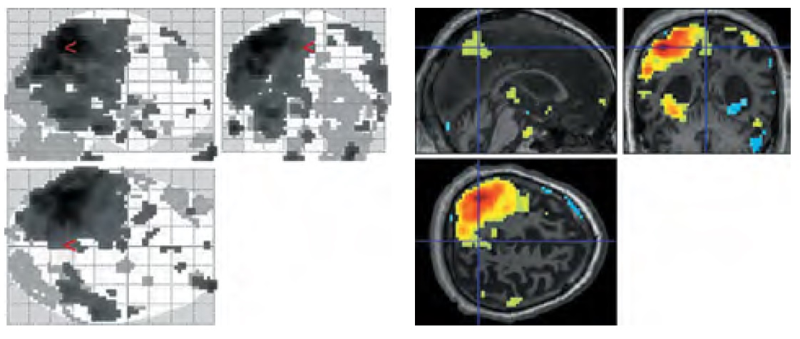 Включённым пациентам проводили МРТ-исследование («MAGNETOM Verio», «Siemens», 3 Т). Были получены данные фМРТ покоя на основании режима Т2*-градиентное эхо (последовательность в 190 измерений — по 36 срезов в каждом массиве), TE/TR = 30/2400 мc, угол наклона 90°; FoV 192 × 192 мм2, толщина среза 3 мм, матрица 64 × 64, угол наклона 90°, продолжительность исследования — 7 мин 40 с. Для последующей нормализации и анатомической локализации данных фМРТ покоя использовали изображения, полученные в режиме 3D-Т1 (TE/TR = 2,47/1900 мс, TI = 900 мс, угол наклона 9°, матрица 256 × 256, FoV 250 × 250 мм2, 176 сагиттальных срезов с изотропным воксельным разрешением 1,0 × 1,0 × 1,0 мм3).