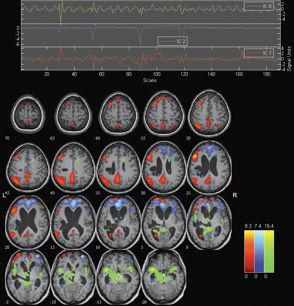 2. Fig. 1 Example of visual assessment of an fMRI component in patients with CDC. The presence of signal from the left angular gyrus, posterior cingulate gyrus, and weak signal from the medial prefrontal cortex is visually assessed.