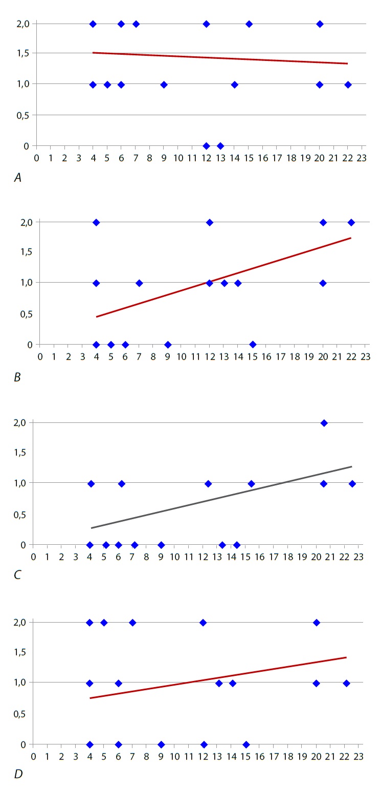 5. Fig. 4. Correlation between the level of consciousness in patients with CDC as measured by the CRS-R, and signal activity from parts of the DMN. А — medial prefrontal cortex; В — posterior cingulate gyrus; С — right angular gyrus; D — left angular gyrus. Along the y-axis — signal intensity: 0 — no signal; 1 — weak/uncertain signal; 2 — presence of signal.