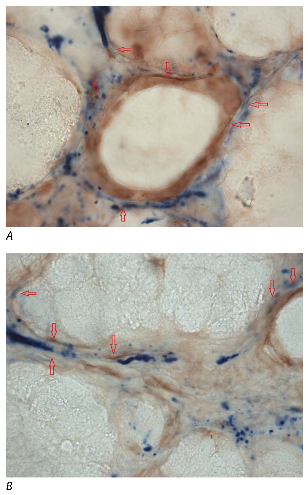 Биопсийный материал для иммуногистохимического исследования обрабатывали по методике [17]. Образцы материала фиксировали в 4% растворе формалина, приготовленном на фосфатном буфере. После этого материал дегидратировали в этиловом, изопропиловом спиртах, смеси изопропилового спирта с хлороформом и заключали в парафиновые блоки. Срезы толщиной 10 мкм помещали на стёкла (по 8 срезов на 1 стекло), покрытые адгезивной средой, и проводили их иммуногистохимическое (иммуноферментное) окрашивание антителами к ф-α-син (clone 81A, ab184674, «Abcam») и к маркеру нервных волокон PGP-9.5 (ab108986, «Abcam»). Для реакции использовали 16 срезов. Демаскировку антигена проводили с помощью теплового метода — нагревания в микроволновой печи мощностью 600 Вт в течение 10 мин в цитратном буферном растворе (0,1 M, pH 6,0). В работе применяли иммуноферментный метод детекции связывания антител. Для выявления двойной метки использовали набор «MultiVision TL-012-MARH» («Thermo Scientific»), основанный на полимерной системе детекции. В качестве негативного контроля использовали окрашивание на срезах без обработки первичными антителами. Для морфологического контроля сохранности материала до проведения иммуногистохимического исследования 16 срезов с каждой биопсии окрашивали гематоксилином и эозином. Независимую оценку полученных препаратов осуществляли три исследователя. Препараты изучали и фотографировали под микроскопом «Leica DMLB» при 100-кратном увеличении. С каждого среза на препарате было случайным образом выбрано по одному полю зрения для получения микрофотографий, которые в дальнейшем использовались для морфометрического анализа.