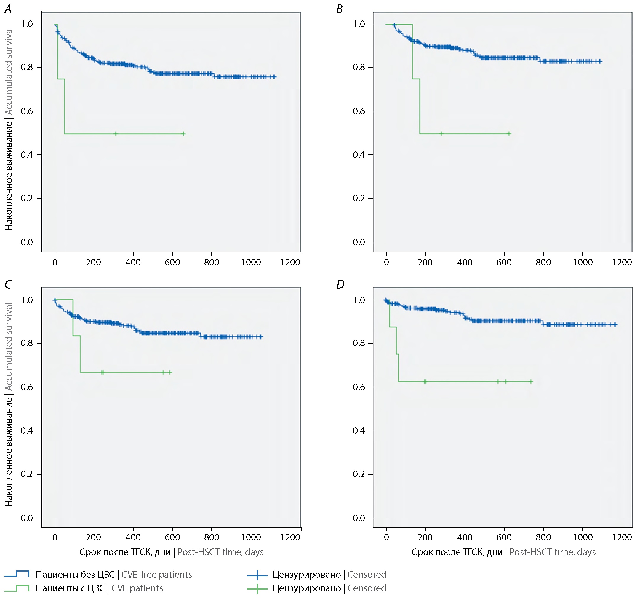 При развитии ЦВС в период 180 дней после ТГСК выживаемость пациентов была ниже в сравнении с группой пациентов без ЦВС: из 8 случаев неблагоприятный исход зафиксирован у 3 пациентов (срок исхода: 401,9 ± 99,6 дня; 95% ДИ 206,6–597,1; р = 0,0001); в группе без ЦВС — из 273 неблагоприятный исход зафиксирован в 21 случае (срок исхода: 901,1 ± 16,9 дня; 95% ДИ 867,9–934,2). Наиболее вероятна связь неблагоприятного исхода с РТПХ, однако подтверждение данной гипотезы также требует дальнейших исследований.