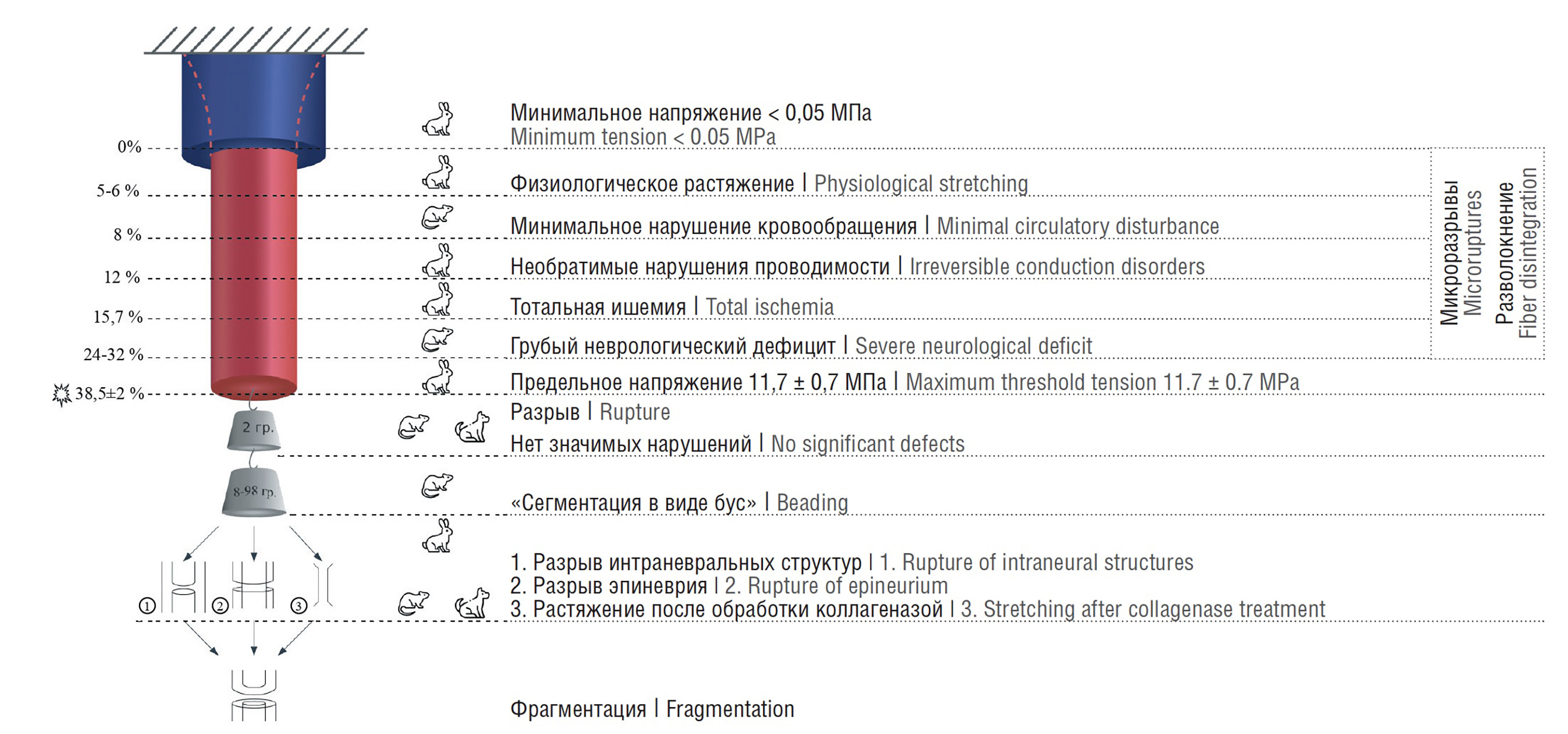 РН приводит к каскаду событий, которые развиваются последовательно, при развитии определённой силы и скорости РН. К таким событиям можно отнести нарушение микроскопической и макроскопической структуры нерва. С этой позиции расстройства проводимости при нарушениях макроскопической структуры нервов кажутся очевидными [41], тогда как на микроскопическом уровне возникающие процессы неоднозначны и требуют пристального внимания. Уровень переносимого нервами напряжения и функциональные нарушения, возникающие в результате превышения этого порога, до конца не изучены.