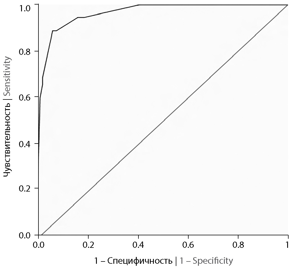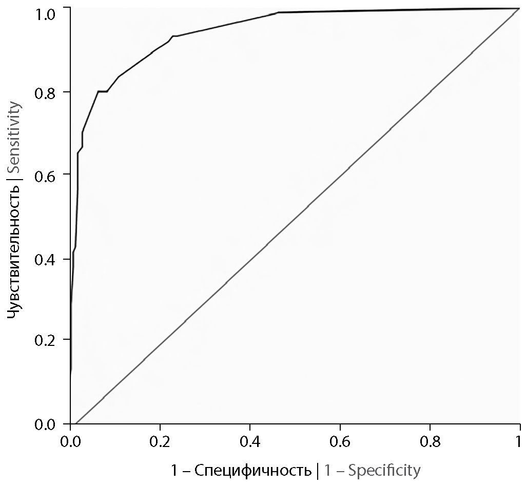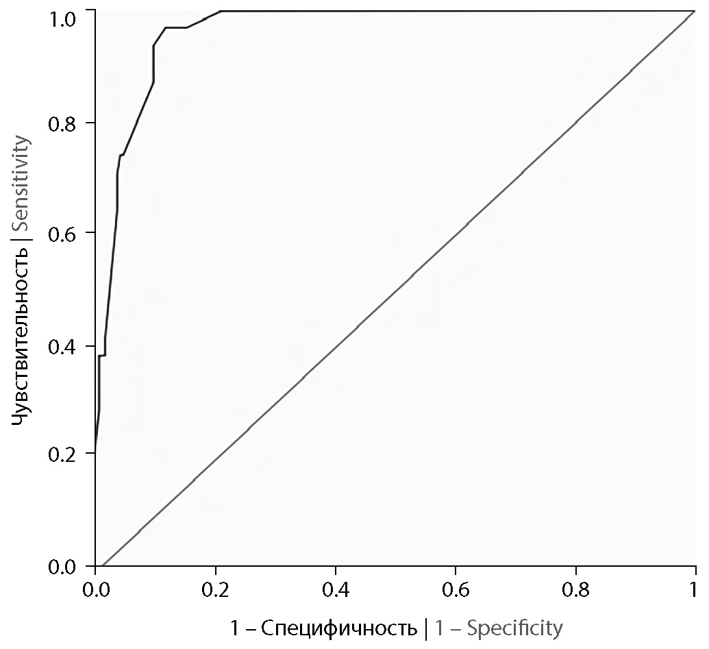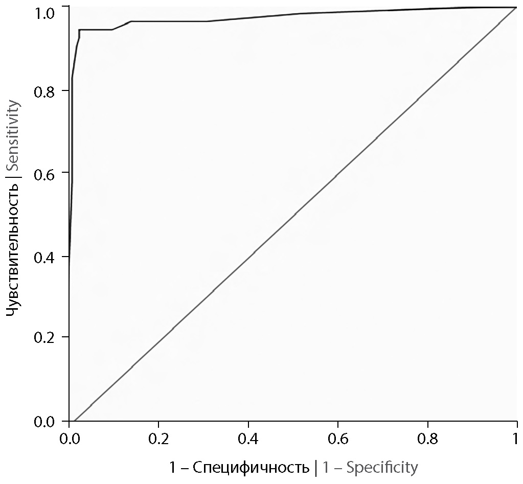 При построении прогностической модели развития атеротромботического ИИ у женщин среднего и пожилого возраста было установлено, что СД2 увеличивает риск развития ИИ более чем в 5 раз, атеростеноз внутренних сонных артерий — в 7 раз, ТИА в анамнезе — в 61 раз, чрезмерное потребление алкоголя — в 49 раз, увеличение степени АГ — в 4 раза (табл. 4). При проверке регрессионной модели площадь под ROC-кривой составила 0,961 [0, 938–0, 985]; р < 0,001 (рис. 2). Чувствительность и специфичность построенной модели при пороге отсечения по предсказанной вероятности развития события 14,5% — 96,8 и 88,0% (индекс Йодена = 0,848).