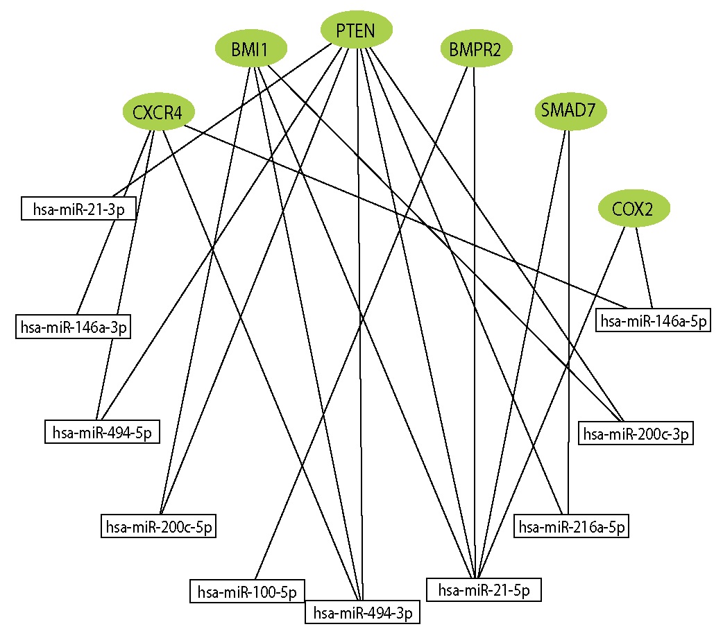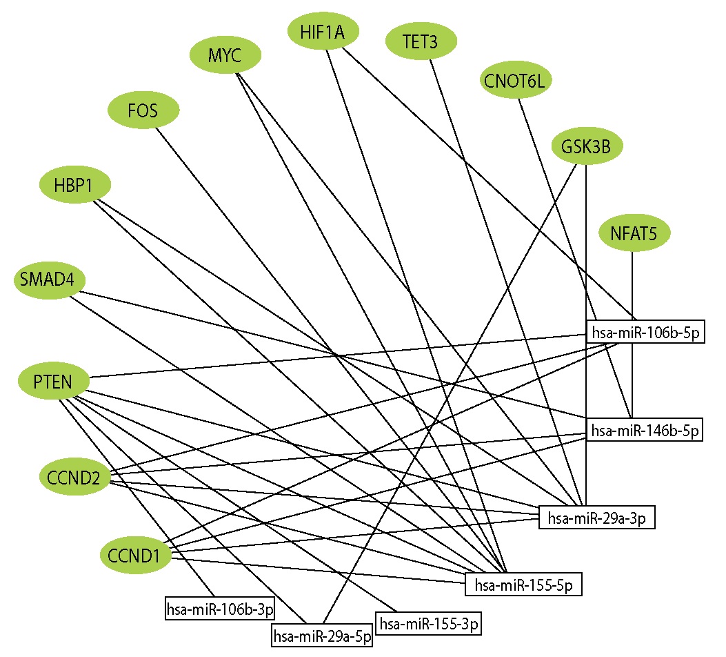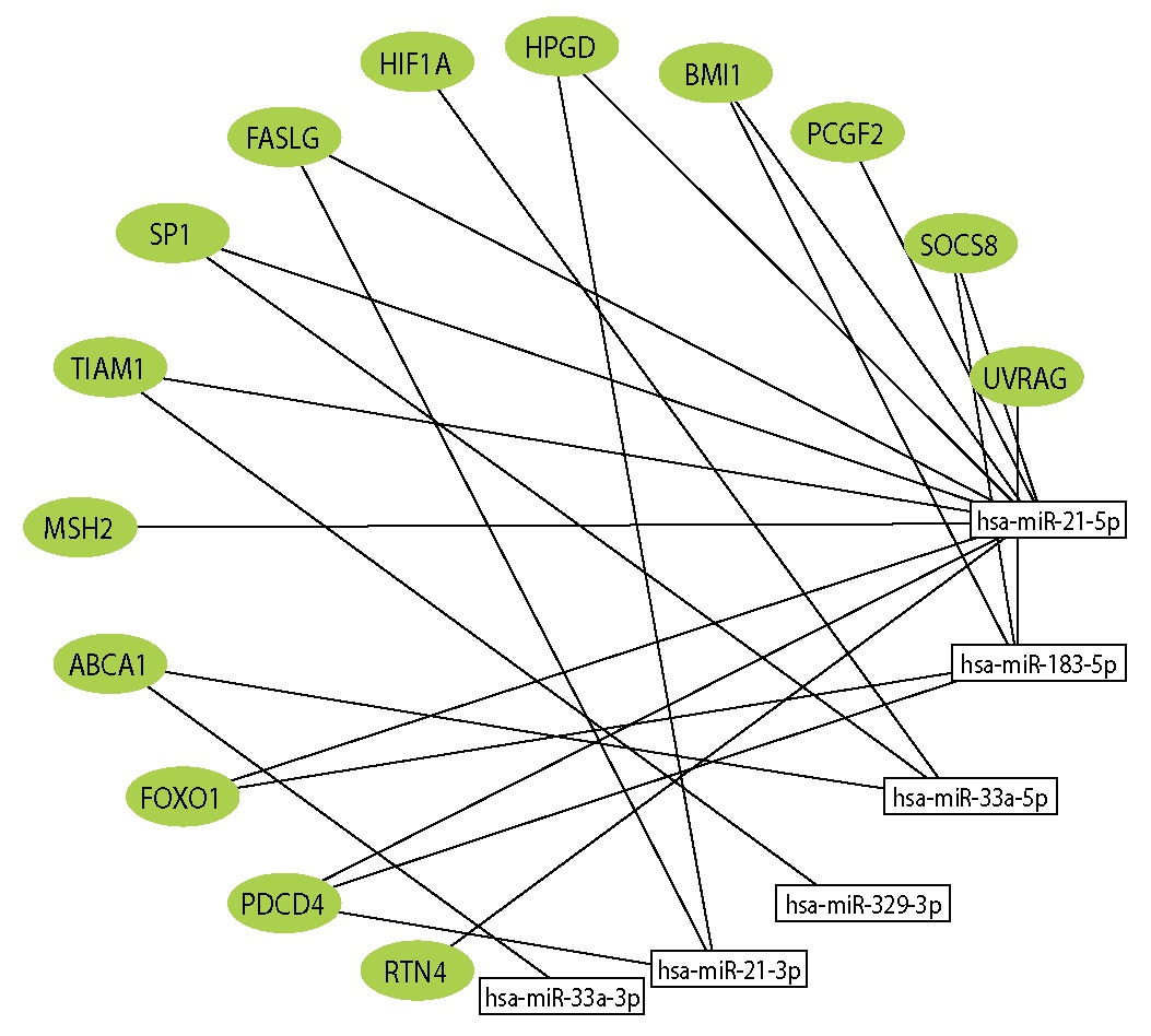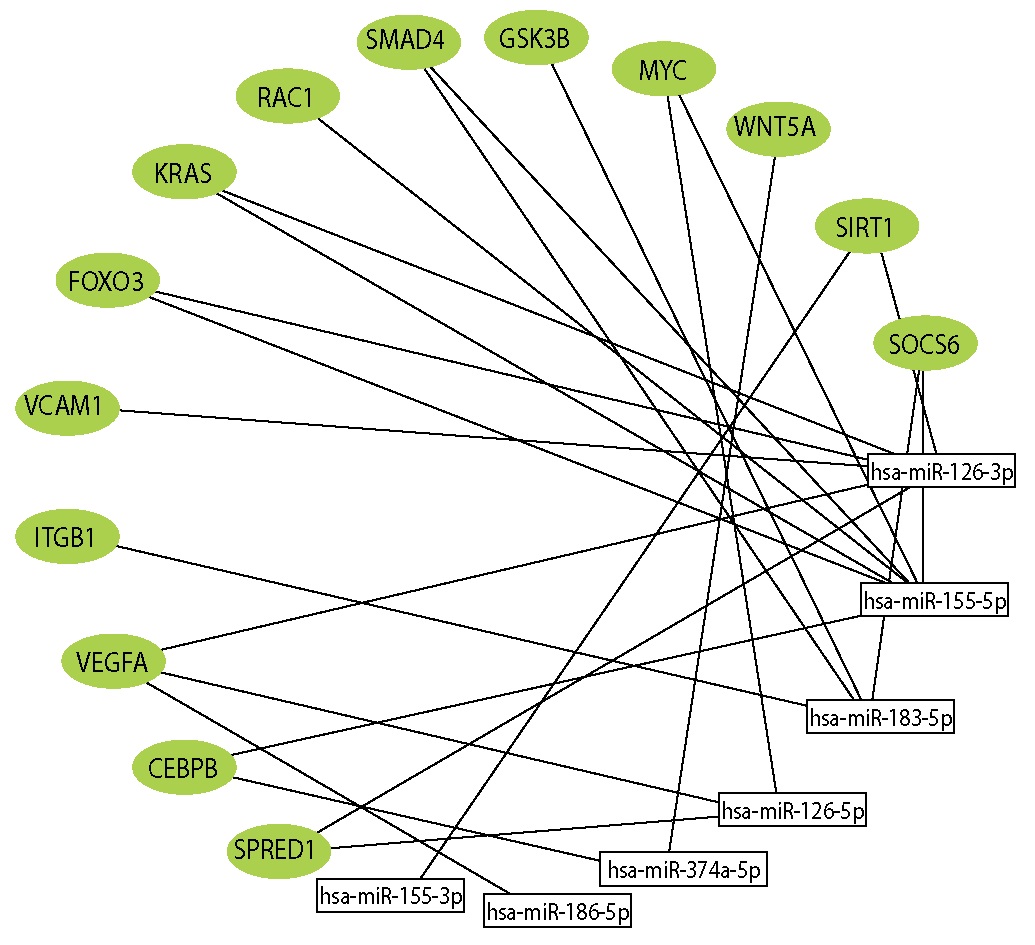 Fig. 4. MicroRNAs associated with angiogenesis regulation and proliferation of smooth muscle cells (rectangles on white) and their targets (ellipses on green).
