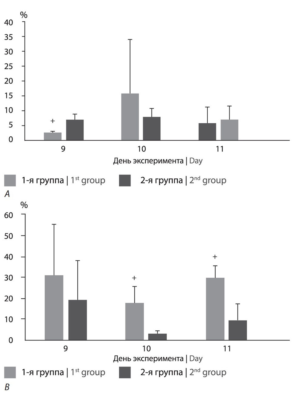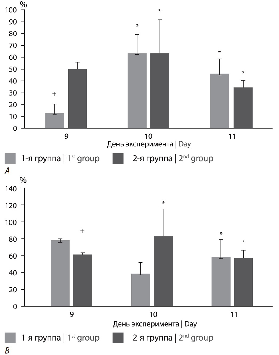 *р < 0,05 по сравнению с 9-ми сутками; §р < 0,05 по сравнению с 10-ми сутками; +р < 0,05 по сравнению сo 2-й группой.