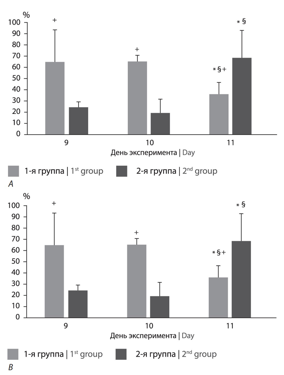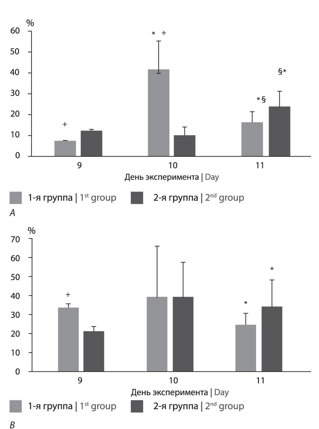 *р < 0,05 по сравнению с 9-ми сутками; §р < 0,05 по сравнению с 10-ми сутками; +р < 0,05 по сравнению сo 2-й группой