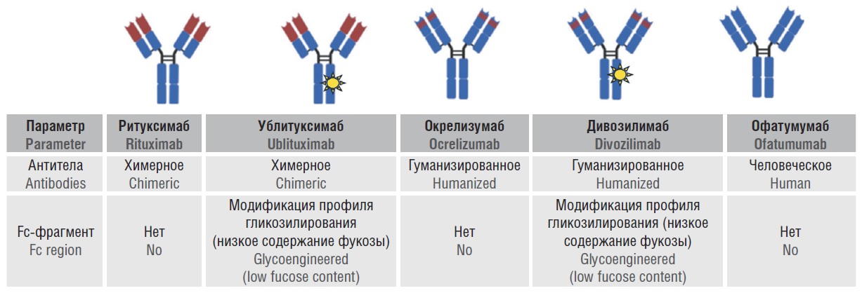 Для таргетной деплеции В-клеток используются препараты моноклональных антител (МКА), синтезируемые путём клонирования уникальной плазматической клетки-предшественницы и обладающие аффинностью к строго определённым кластерам дифференцировки на поверхности лейкоцитов. Кластеры дифференцировки — поверхностные мембранные белки лейкоцитов, экспрессия которых отражает принадлежность клетки к конкретной субпопуляции со своими специфичными функциями [37]. К данным белкам могут быть синтезированы антитела, которые при связывании с антигеном приводят к лизису клетки за счёт прямой гибели, комплемент-зависимой цитотоксичности и антителозависимой клеточной цитотоксичности. Наиболее часто в качестве мишеней для таргетной терапии выступают CD20, CD19, CD22, CD52 [38]. В практике используются мышиные, химерные (гуманизированы на 65%), гуманизированные (на 66–99%) и полностью человеческие антитела. По мере увеличения человеческих белков снижается иммуногенность препарата [39].