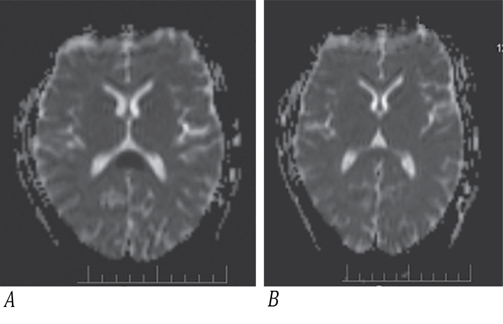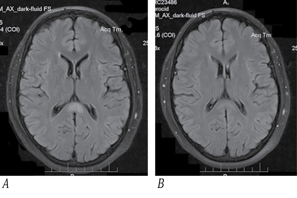 А — 1-й день госпитализации, в ВМТ — единичный симметричный очаг гиперинтенсивного МР-сигнала с достаточно ровными и чёткими контурами; В — 13-й день госпитализации, практически полный регресс очага.