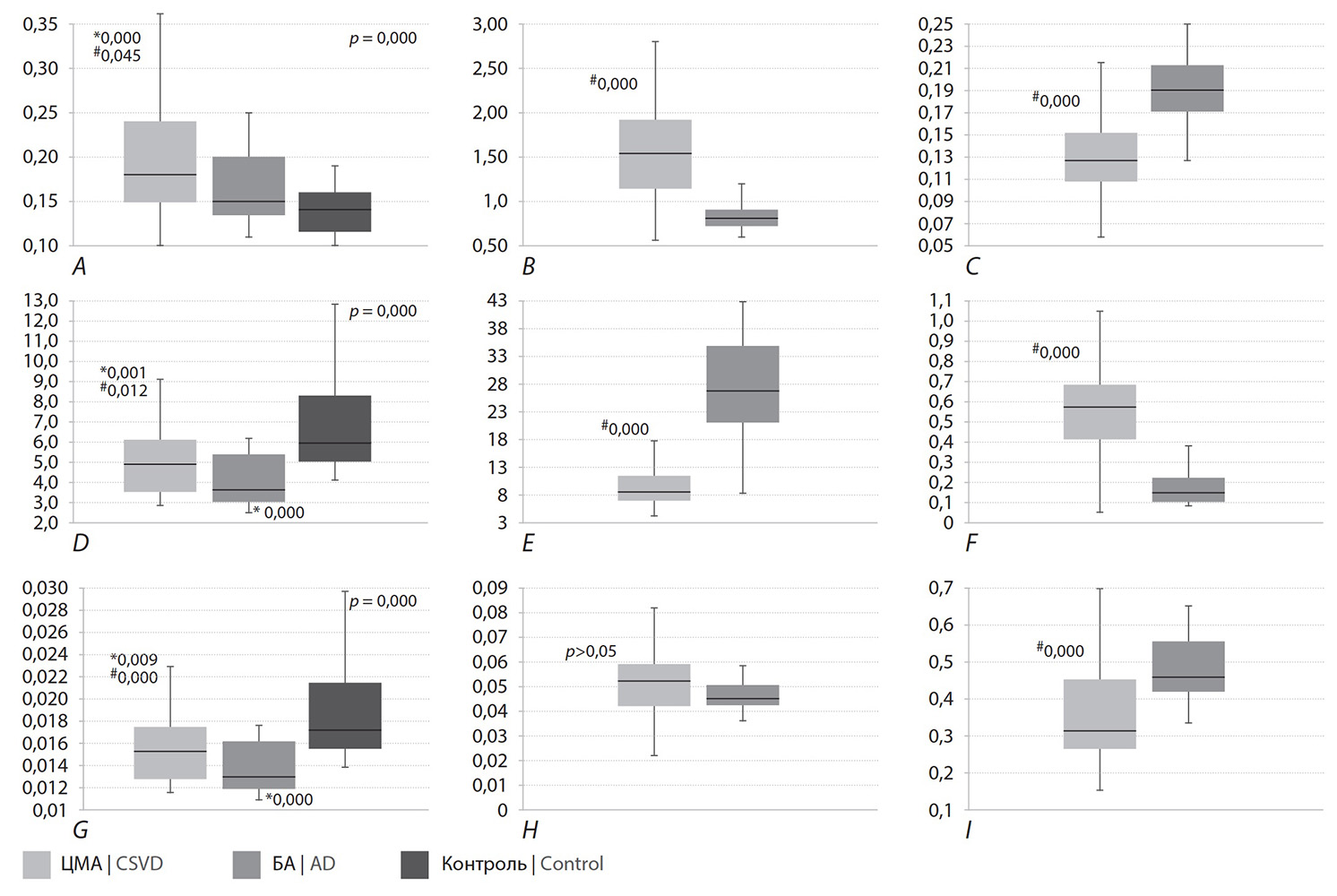 А — GFAP в крови, нг/мл; В — GFAP в ЦСЖ, нг/мл; С — GFAP кровь/ЦСЖ; D — NSE в крови, мкг/мл; Е — NSE в ЦСЖ, мкг/мл; F — NSE кровь/ЦСЖ; G — NEFL в крови, нг/мл; H — NEFL в ЦСЖ, нг/мл; I — NEFL кровь/ЦСЖ.