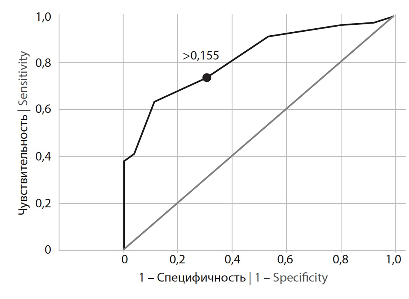 Установлена предиктивная роль GFAP крови в отношении развития ЦМА (рис. 2). Уровень GFAP > 0,155 нг/мл (площадь под кривой 0,82 (95% ДИ 0,73–0,90), чувствительность модели — 74%, специфичность — 70%) позволяет дифференцировать ЦМА от здоровых лиц.