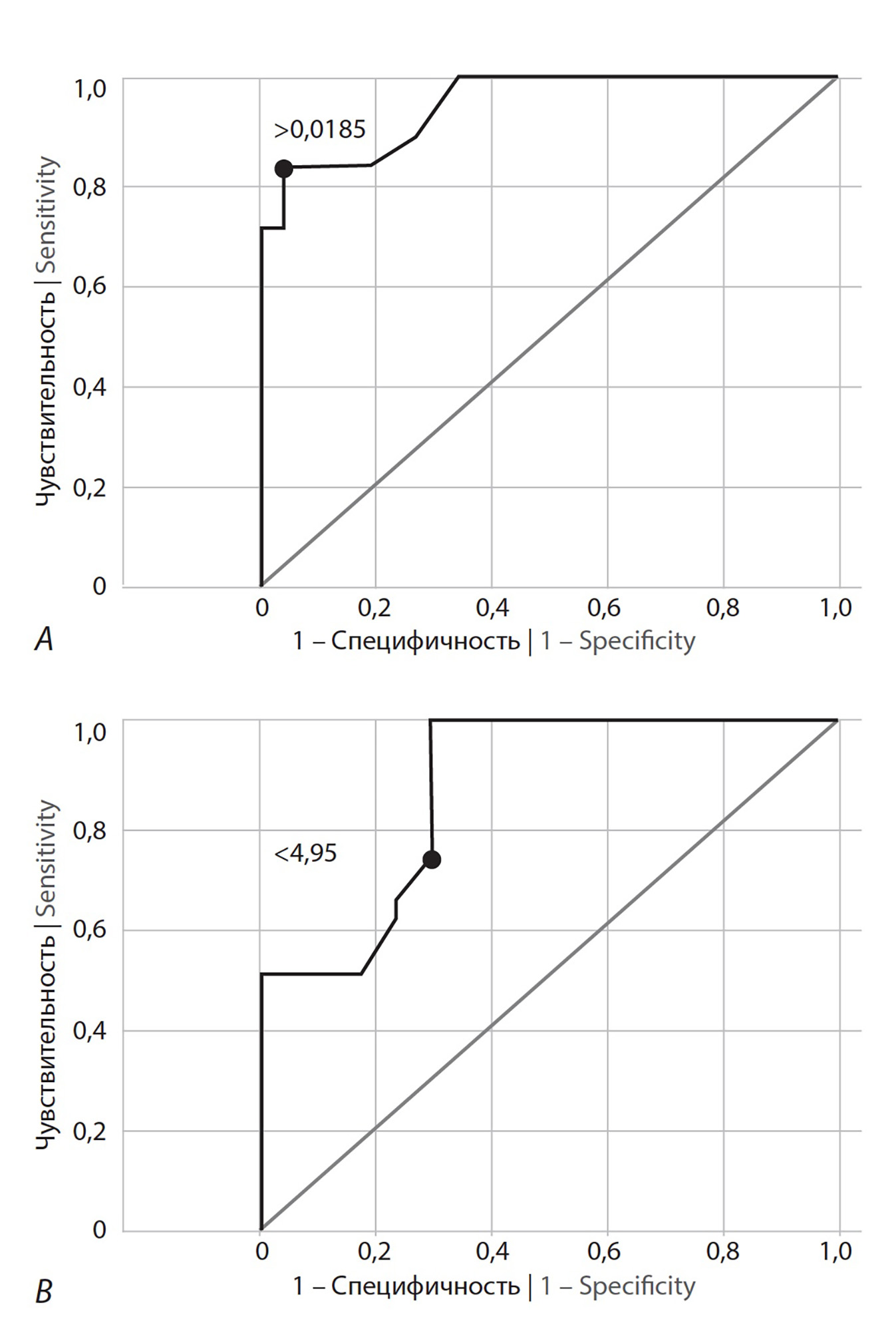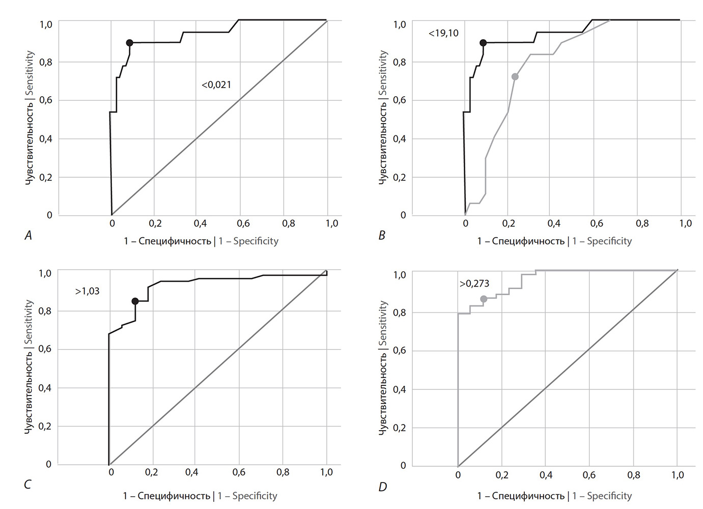Статистический анализ проводили с помощью программного обеспечения «SPSS Statistics v. 26» («IBM»). Основной описательной статистикой для категориальных и порядковых переменных были частота и процентная доля, для количественных переменных — средние значения и среднеквадратичное отклонение или медиана и квартили. Во всех случаях использовали двусторонние варианты статистических критериев. Нулевую гипотезу отвергали при p < 0,05. Сравнительный анализ качественных показателей проводили при помощи критерия χ2 Пирсона или точного критерия Фишера. Значения лабораторных показателей сравнивали при помощи критерия Манна–Уитни или Краскела–Уоллиса с последующим внутригрупповым попарным анализом по методу Манна–Уитни. Для оценки предсказательной способности показателей в развитии ожидаемых исходов использовали ROC-анализ с определением площади под кривой, чувствительности и специфичности для установленного порогового значения.