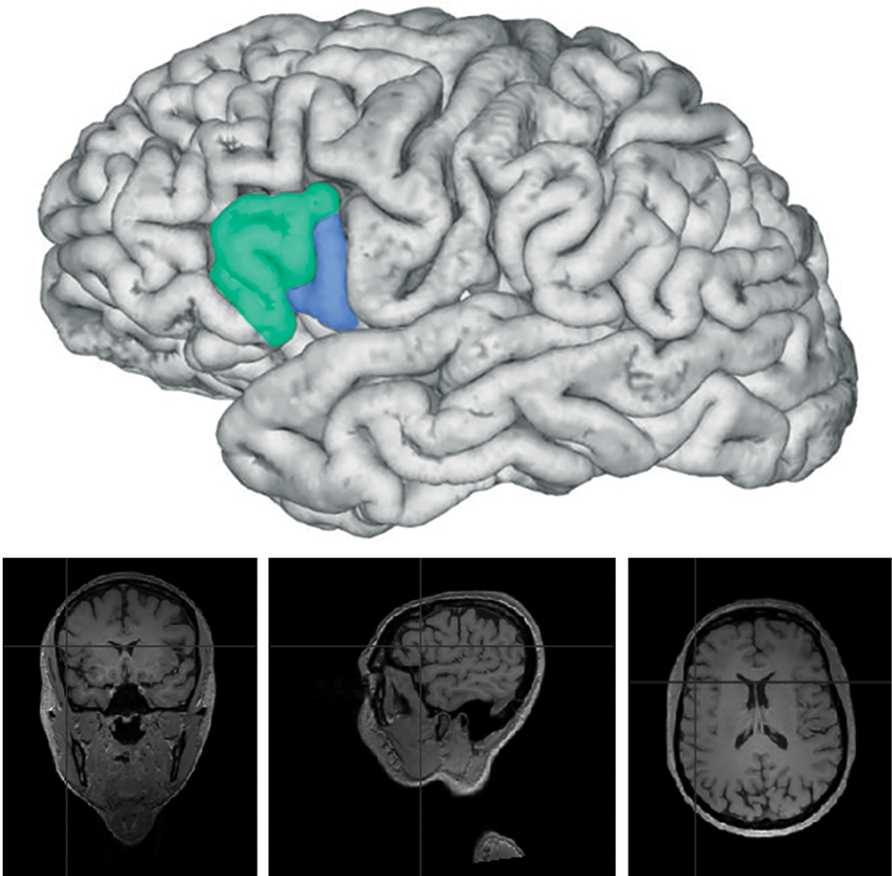 Fig. 1. Structure of Broca’s area in the brain of a female musician, LH. Triangular region is shown in green; opercular region is shown in blue.
