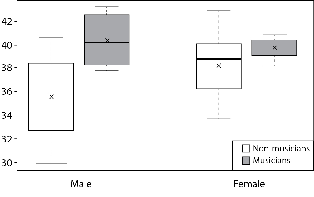 In male musicians, relative volume of the gray matter as a percentage of total brain volume was greater than in male non-musicians (р = 0.048): median relative volume of the gray matter as a percentage of total brain volume was 36.00% ± 4.05% in male non-musicians and 40.25% ± 3.68% in male non-musicians. In women, differences were not considered significant (p = 0.44; Fig. 3).
